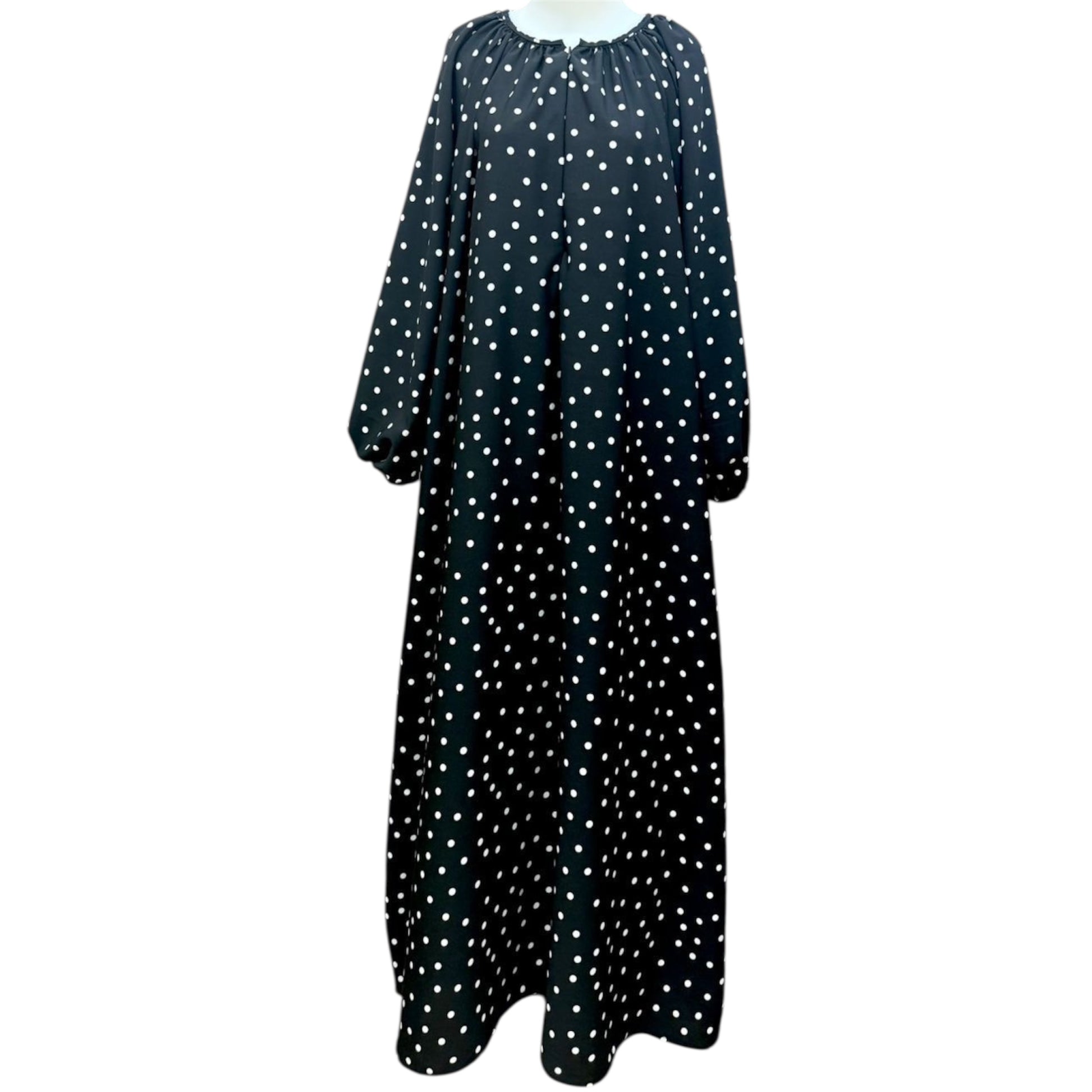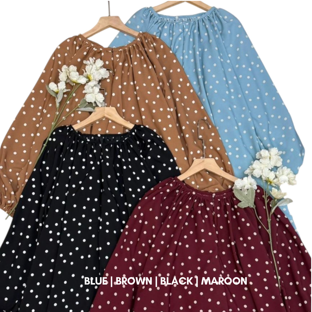 The Rawdah Polka Maxi Dress is made from Cotton Lux material. It comes in a one-size-fits-all design, suitable up to XXL. This versatile dress ensures comfort and style for various occasions.
