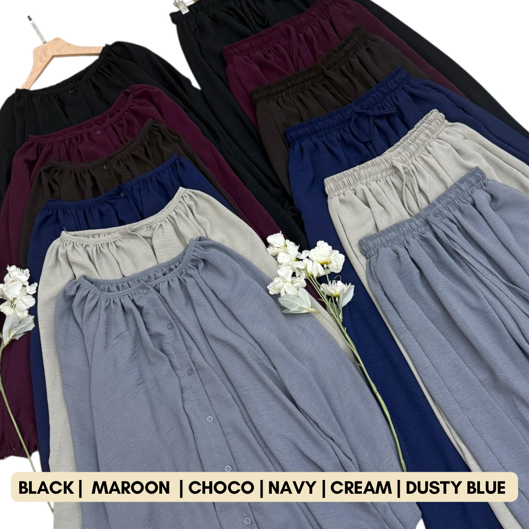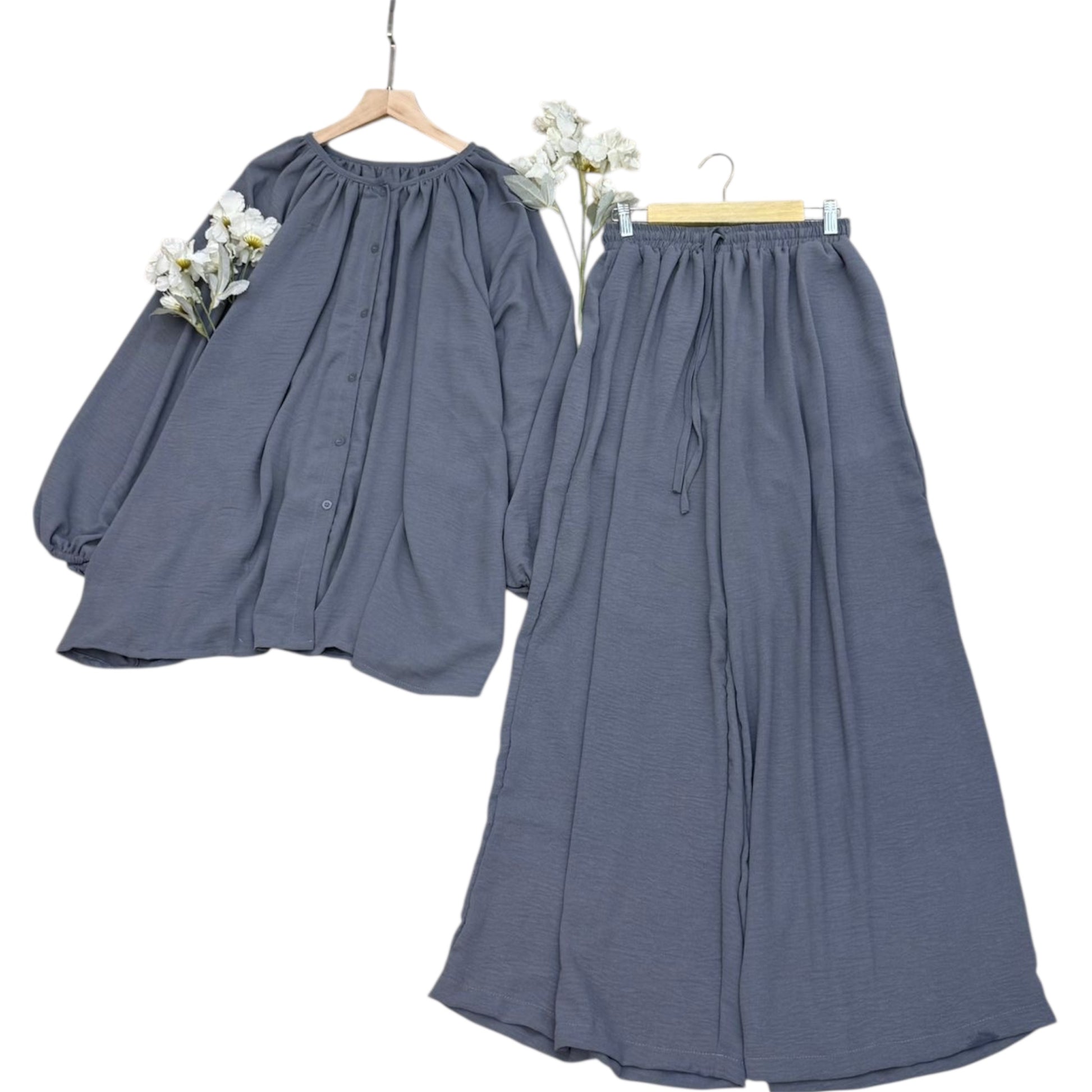 SALEHA is the perfect addition to your wardrobe with its premium crinkle material that gives it a unique and stylish look. The top features a round neck, front zipper, and raglan sleeve with guttered cuffs for added comfort. Its bottom boasts a stretchable waistband with adjustable drawstring, full-length wide legged pants, and right and left pockets, making it both stylish and practical. Available in one size that fits up to XXL.