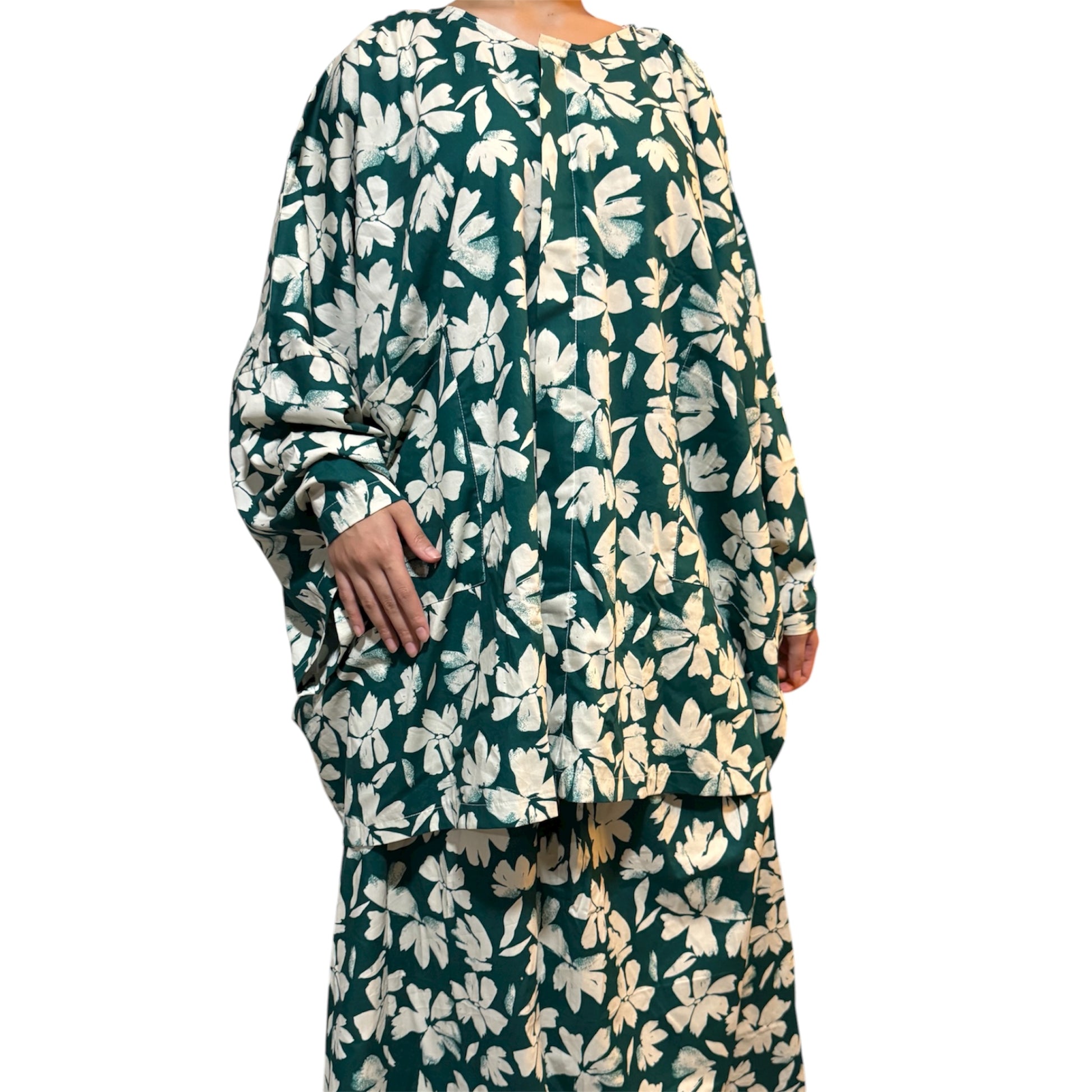 SAMEERA is made from high-quality cotton material and is designed to fit all sizes up to XXXL. The top features an oversized design with a round neck and convenient front zipper for nursing mothers. It also includes front pockets and kimono sleeves with concealed buttons for maximum coverage. The bottom is a comfortable maxi skirt with a stretchable waistband and convenient right and left pockets.